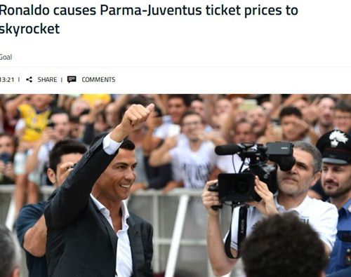 C罗加盟尤文使得整个意甲得益,众多球迷都翘首以盼可以亲眼见到C罗,而这也使得黄牛党们高兴了起来。来自《goal》的消息称,意甲新赛季第三轮帕尔马主场与尤文图斯的门票已经被炒高了六倍多,为了亲眼看见C罗,球迷需要花费178欧元。