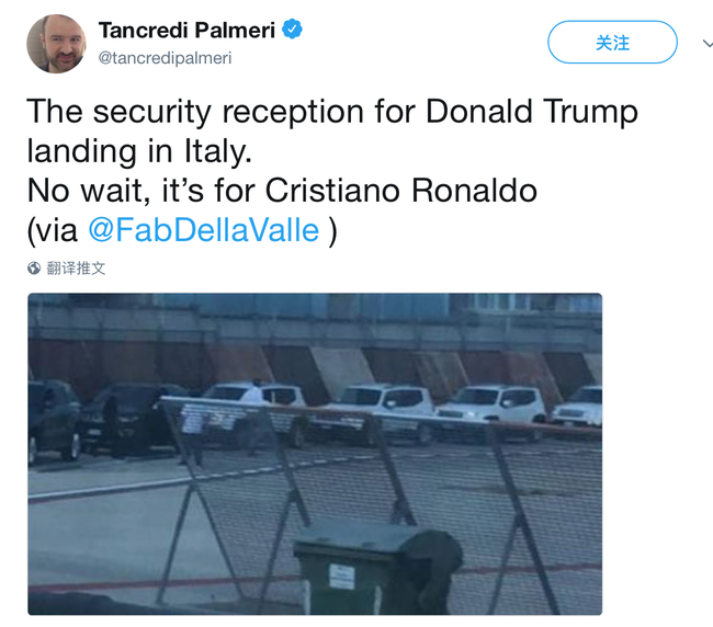 C罗抵达都灵后,《拜因体育》的记者Tancredi Palmeri发布了一条推特调侃道:“安保人员正在等待特朗普着陆意大利,噢不,等一下,是克里斯蒂亚诺-罗纳尔多。”尤文图斯接机C罗使用如此浩大阵仗着实令人看呆。