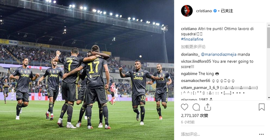 意甲3轮战罢,总裁已经完成23脚射门,场均7.7射位居5大联赛射门榜,大多球迷不禁开始想,难道C罗换一个地方就真的不行了吗?但C罗似乎并不在意这些数据,虽然自己没能取得进球,数据不够漂亮,但C罗最开心的事情是球队拿下三分。赛后C罗在ins上发了一张庆祝图,并用意大利语写道:“再次拿下三分,团队精神至关重要!”