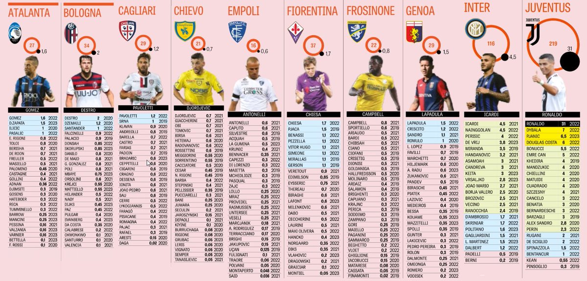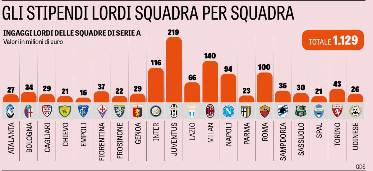 就如每个赛季一样,《米兰体育报》也在近日公布了一份意甲每支球队各位球员的薪酬情况。这个赛季,意甲20支球队的总工资超过了11亿欧元。