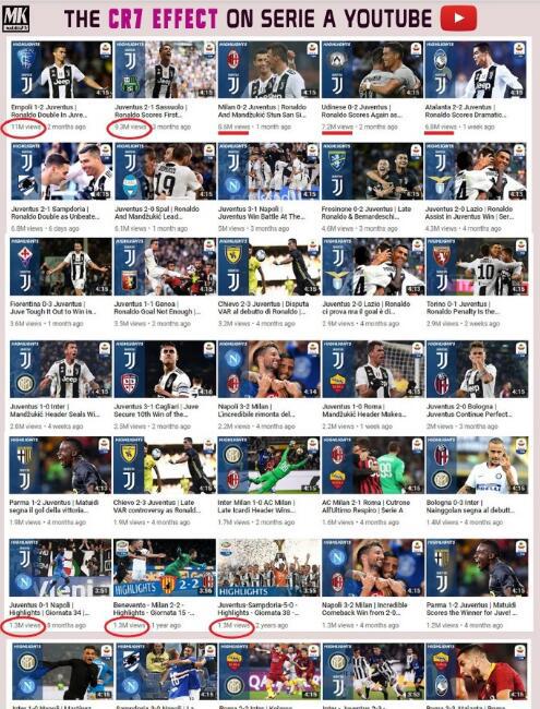 在播放量峰值上,C罗加盟前,播放量最高的是那不勒斯与尤文图斯的比赛集锦,仅为130万次,而C罗来到尤文后,意甲官方频道中的播放次数最多的视频是尤文客场对战恩波利的比赛,播放量达到1100万人。同时根据统计,在意甲频道中的视频播放量位居前十的视频的封面中全部有C罗。