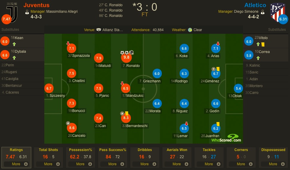 尤文3-0战胜马竞后,Whoscored为在比赛中戴帽的C罗打出全场最高的9.8分。