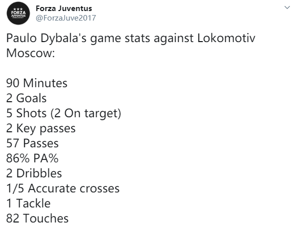 本场比赛迪巴拉共出场80分钟,打进2球,5次射门(2次打在门框范围内),2次关键传球,57次传球,传球成功率86%,2次过人,5传球成功1次,1次抢断,82次触球。(原推90分钟为误)