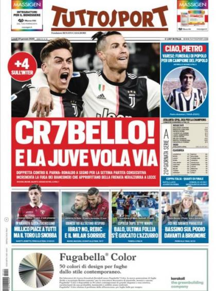 随后,《都灵体育报》封面也是聚焦葡萄牙人,并表示:CR7干得漂亮,帮助尤文在积分榜上与国米拉开差距。