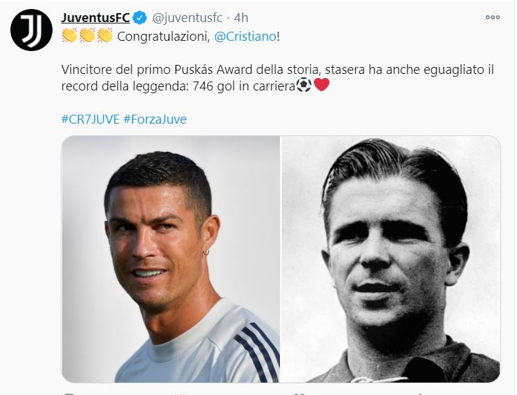 尤文官推赞C罗:首届普斯卡什奖得者追平了普斯卡什的纪录