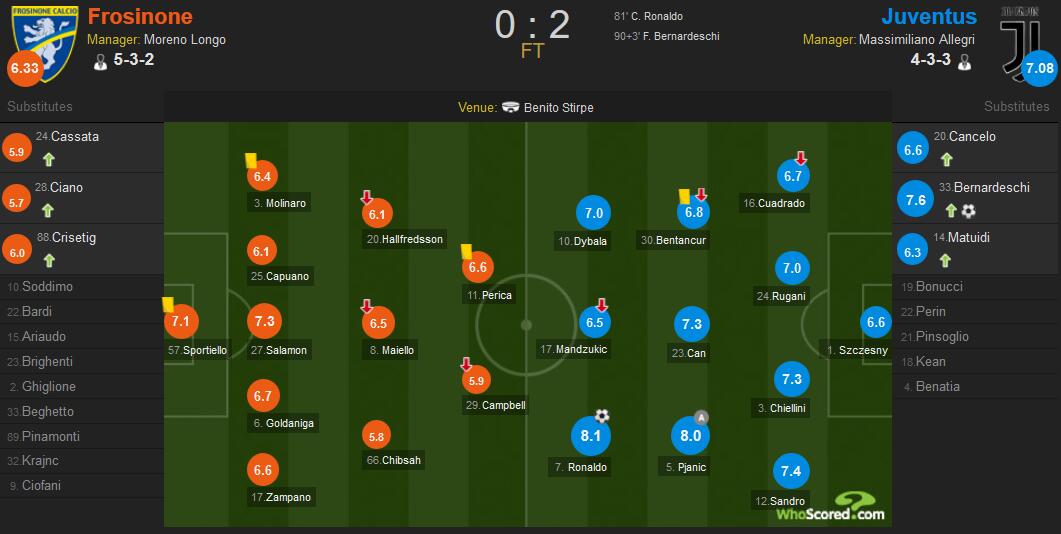 C罗关键时刻力挽狂澜打破僵局帮助尤文敲开胜利之门获得全场最高的8.1分,皮亚尼奇最后时刻助攻贝尔纳代斯基破门获得8.0分;弗罗西诺内方面,萨拉蒙获得全队最高的7.3分。