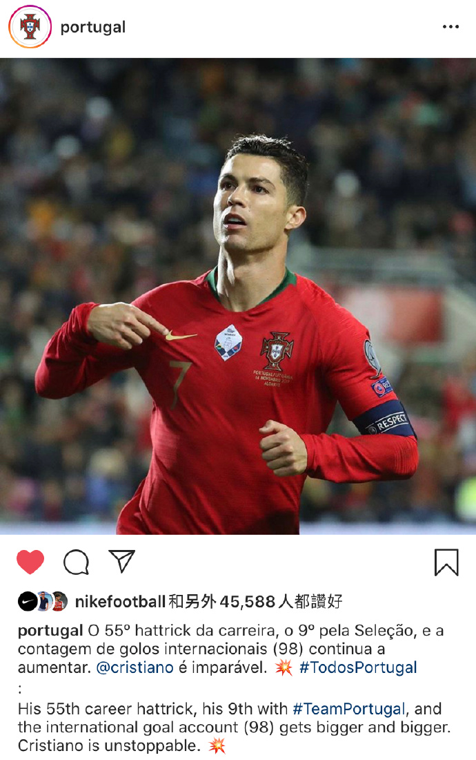 赛后,葡萄牙国家队官方推特写道:“C罗职业生涯55个帽子戏法达成,其中在葡萄牙国家队打进了9个帽子戏法,为国家队打进了98球。”