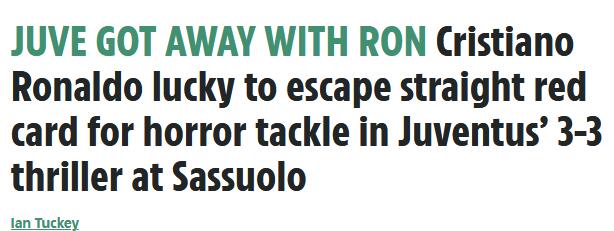 尤文图斯3比3战平萨索洛,比赛中,C罗的一次争议动作逃过了裁判的红牌处罚。