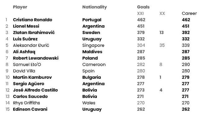 根据国际足球历史和统计联合会公布的数据,进入21世纪的二十年,C罗是进球最多的人,比梅西多出了41球。