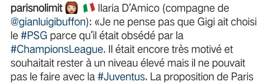 “我不认为布冯是因为想拿欧冠才去的巴黎。他对于工作仍然动力十足,也想保持在高水平的竞技状态当中,但他在尤文很难做到这些了。巴黎给他的提议让他非常满意,他甚至没有犹豫就选择加盟了巴黎。”