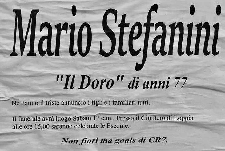 “Mario Stefanini,大家都称他为‘Doro’,享年77岁,他的家人们为您宣布这个悲痛的消息:老人的葬礼将于本周六下午在Loppia公墓举行。不要鲜花,请献给他CR7的进球。”